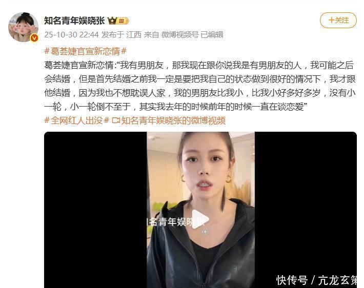 一石激起千层浪!10月30日晚,葛荟婕在直播中大方官宣新恋情,一句“我有男朋友”瞬间引爆热搜。这次她不仅坦然承认恋情,更主动曝出男方“比我小好多好多岁”,随后又紧急澄清“没有小一轮”,真实反应让网友直呼“姐这次是真的清醒了”。